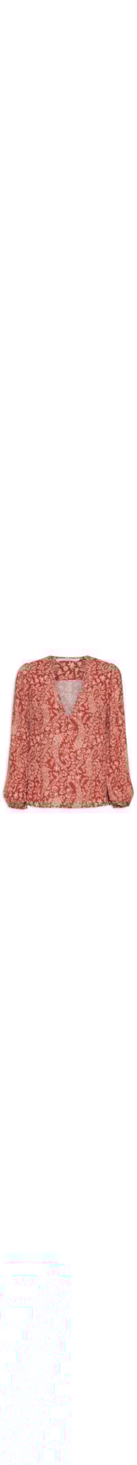 A bata vermelha é confeccionada em tecido leve sem elasticidade. A peça solta ao corpo possui decote V com cordão transpassado, mangas longas com elástico embutido nos punhos e estampa paisley na cor bege.