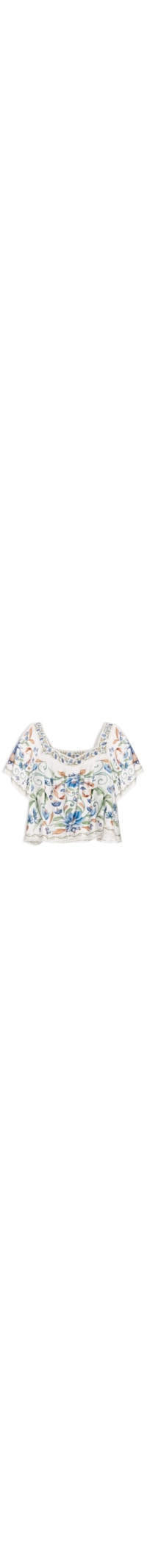 A bata branca é confeccionada em tecido leve sem elasticidade. A peça solta ao corpo possui decote quadrado, mangas curtas com aplicação de passamanaria na barra, mix de estampas em cores contrastantes e comprimento cropped*.