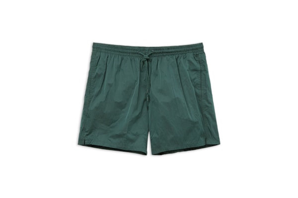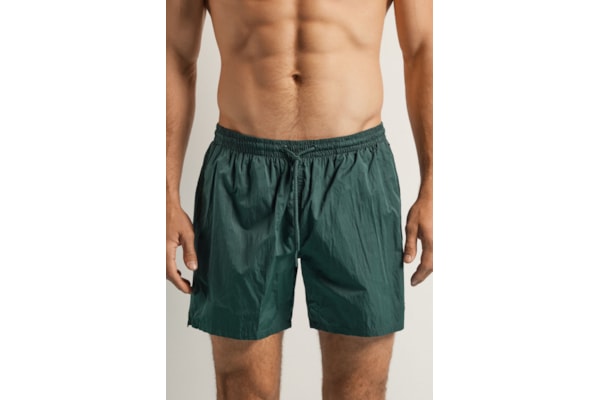 Bermuda de banho lisa, confeccionada em tecido firme e encorpado, à prova d’água e de secagem rápida. Possui forro interno em formato de cueca, feito em microfibra macia no mesmo tom. A cintura com elástico franzido e cordão traz uma prática abertura lateral para chave. Também pode ser usada como bermuda para momentos de lazer.