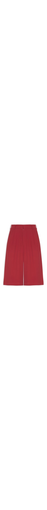 A bermuda vermelha é confeccionada em tecido leve sem elasticidade. A peça solta ao corpo possui cintura alta, cós com passantes aplicados, bolso frontal embutido, bolsos posteriores decorativos, comprimento curto e fechamento frontal por zíper e colchetes.