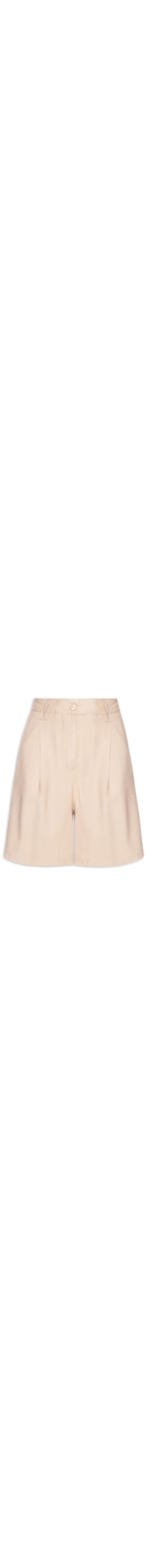 A bermuda bege é confeccionada em tecido leve sem elasticidade. A peça possui cintura alta, cós com passantes, pregas frontais, e bolsos frontais modelo faca, comprimento curto e fechamento frontal por zíper e botão.