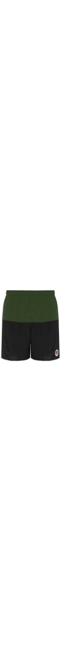 A bermuda verde é confeccionada em nylon. A peça solta ao corpo possui cintura média, cós elástico embutido para ajuste, bolsos frontais embutidos, bolso posterior com fechamento por aba, detalhe de recorte frontal e posterior na cor preta, tag aplicada na parte frontal, comprimento curto e acabamento pespontado.