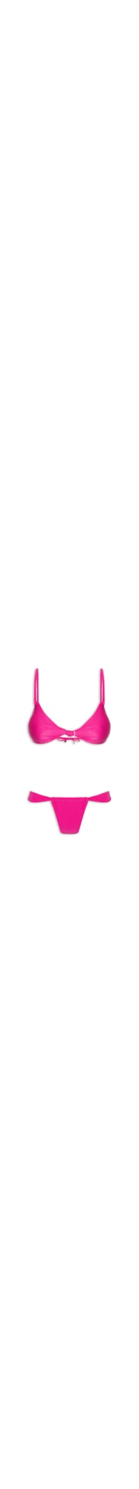 O biquíni rosa é confeccionado em malha cirrê de média elasticidade. O top de modelo bandeau, possui alças finas com regulagem, detalhe de nó frontal, bojo removível, forro e fechamento posterior por amarração. A calcinha de modelo cortininha, possui cintura baixa, laterais médias e forro.