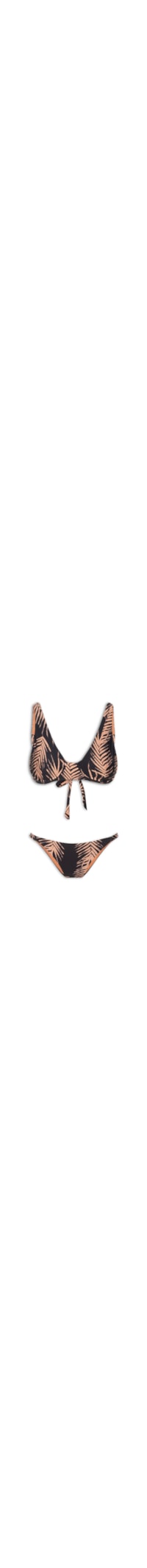 O biquíni preto é confeccionado em malha de poliamida com média elasticidade. O top de modelo meia taça possui alças médias, aro de sustentação, forro, estampa figurativa de folhagens e fechamento posterior por amarração. A calcinha de modelo tanga possui laterais finas com elástico embutido, forro e estampa figurativa de folhagens.