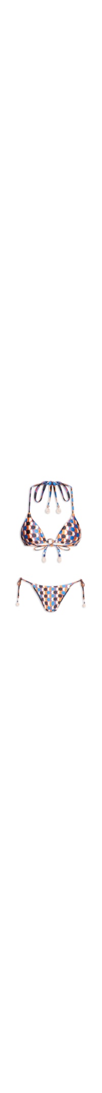 O biquíni preto é confeccionado em malha de poliamida com elastano de alta elasticidade. O top cortininha com decote em V, alças finas ajustáveis com amarração no pescoço e nas costas, estampa em cores contrastantes e detalhe frontal em argola. A calcinha modelo cortininha com laterais ajustáveis por amarração, acabamento dupla face com face interna lisa em preto, estampa em cores contrastantes e ponteiras decorativas aplicadas nas extremidades das amarrações.