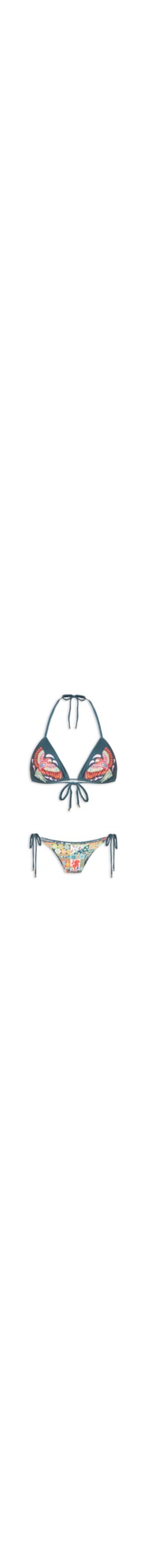 O biquíni azul é confeccionado em malha leve com média elasticidade. O top de modelo cortininha possui alças finas reguláveis por amarração posterior, estampa figurativa em cores contrastantes, forro e fechamento posterior por amarração. A calcinha de modelo tanga possui laterais finas ajustáveis por amarração, estampa figurativa em cores contrastantes e forro.