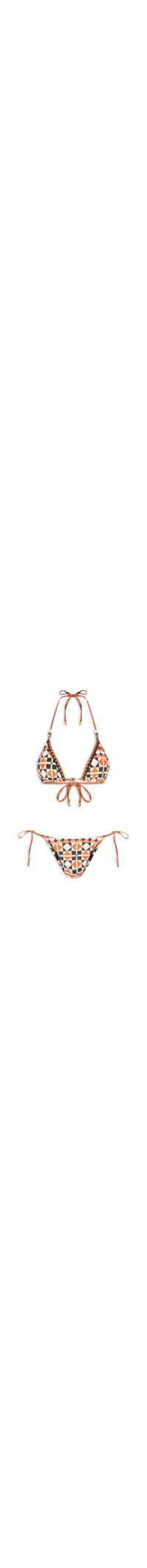O biquíni preto é confeccionado em malha de poliamida com média elasticidade. O top possui decote em V, alças finas ajustáveis, caimento ajustável ao busto, estampa geométrica contrastante, detalhe de miçangas aplicadas no centro, acabamento pespontado e fechamento posterior por amarração. A calcinha possui laterais finas com tiras estendidas, caimento ajustado ao quadril, estampa em cor contrastante, forro e fechamento lateral por amarração.