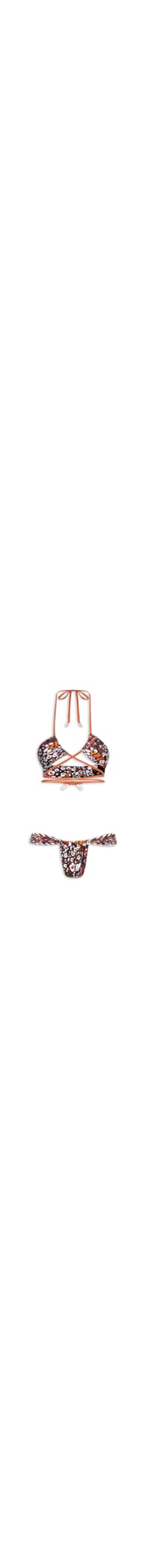 O biquíni preto é confeccionado em malha de poliamida com alta elasticidade. O top de modelo cortininha invertida possui decote halter, alças finas e alongadas para amarração, mix de estampas em cores contrastantes, bojo removível e forro. A calcinha de modelo cortininha possui tiras nas laterais com acabamento torcido aplicadas, mix de estampa em cores contrastantes e forro.