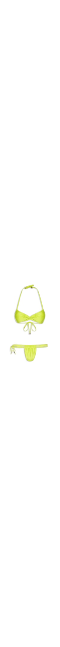 O biquíni verde é confeccionado em malha de poliamida com superfície texturizada e alta elasticidade. O top de modelo cortininha possui alças finas, forro, bojo removível, laterais largas, tiras médias cruzadas na parte frontal e fechamento posterior por amarração. A calcinha de modelo string possui laterais duplas, forro e fechamento lateral por amarração.