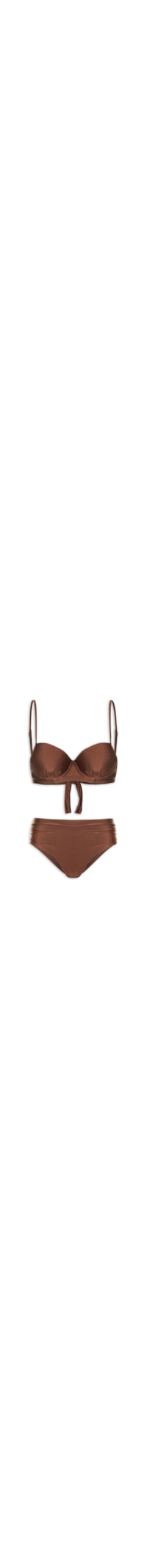 O biquíni marrom é confeccionado em malha de poliamida com baixa elasticidade. O top possui decote meia taça, finas reguláveis, laterais médias, bojo removível, forro e fechamento posterior por amarração. A calcinha de modelo hot pant* possui cintura alta, laterais grossas com efeito franzido e forro.
