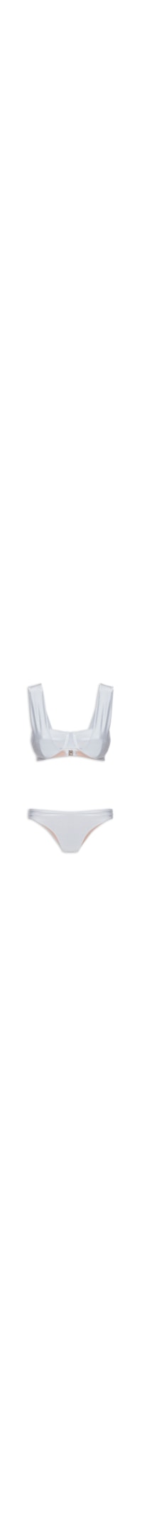 O biquíni prata é confeccionado em malha cirrê com alta elasticidade. O top possui decote meia taça, alças largas sobreposta na parte frontal, recortes frontais, aros metálicos embutidos na altura do busto, laterais largas, forro, sem bojo e fechamento posterior por colchetes. A calcinha de modelo tanga possui cintura baixa, laterais médias e forro.