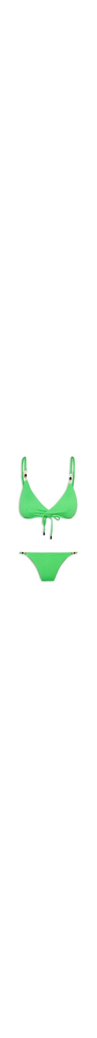 O biquíni verde é confeccionado em malha de poliamida com superfície texturizada. O top possui decote V, alças finas com regulagem e detalhes em pedraria na parte frontal, fechamento posterior por amarração por cordões com aviamentos aplicados. A calcinha possui cintura baixa, laterais finas com detalhe de pedraria na parte frontal, média cobertura.