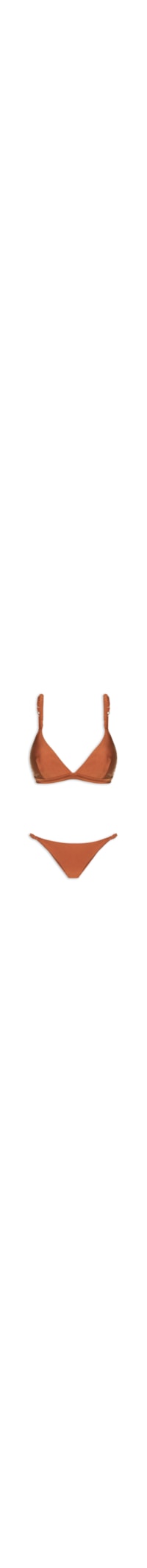 O biquíni marrom é confeccionado em malha cirrê com alta elasticidade. O top de modelo triângulo possui decote V, alças finas com regulagem e elástico embutido, bojo removível, forro, e não possui fechamento. A calcinha de modelo string possui laterais finas com elástico embutido e forro.
