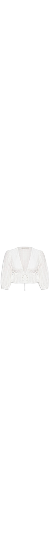 A blusa branca é confeccionada em tecido leve sem elasticidade. A peça solta ao corpo possui decote V profundo, mangas 3/4 com elástico embutido nos punhos, padronagem abstrata texturizada, elástico embutido na cintura, efeito franzido na cintura, comprimento *cropped, fechamento frontal por amarração.
