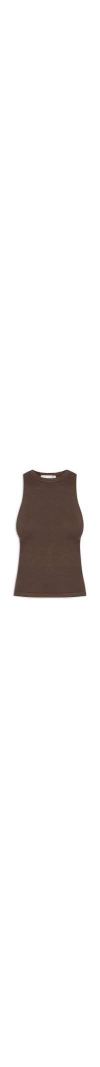 A blusa marrom é confeccionada em tricot com alta elasticidade. A peça justa ao corpo possui decote redondo, alças médias, sem bojo e cavas regulares.