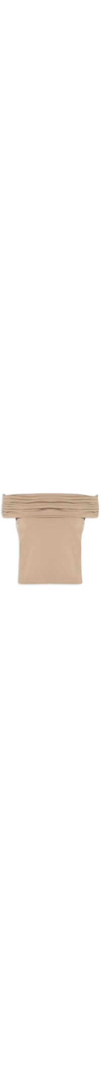 A blusa bege é confeccionada em tecido leve com baixa elasticidade. A peça solta ao corpo possui decote ombro a ombro, cavas levemente alongadas e efeito plissado na altura do decote.