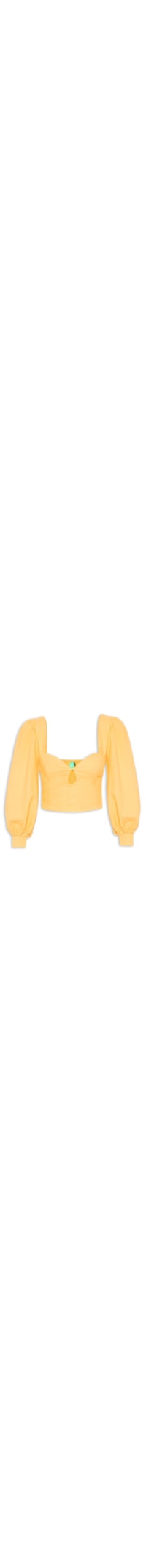 A blusa amarela é confeccionada em tecido leve com toque de linho sem elasticidade. A peça justa ao corpo possui decote princesa com detalhe de recorte vazado parte frontal, mangas longas e bufantes com recorte em lastex nos punhos, lastex embutido na parte posterior, forro, sem bojo e comprimento cropped*.
