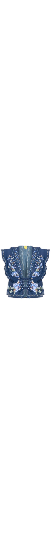 A blusa azul é confeccionada em tecido leve sem elasticidade. A peça solta ao corpo possui decote V profundo, alças largas, cavas alongadas, tiras finas alongadas aplicadas na parte frontal, recorte na altura da cintura, recortes sobrepostos com efeito de babados, mix de estampas em cores contrastantes e fechamento frontal por amarração.