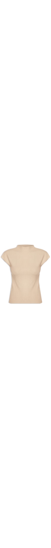 A blusa bege é confeccionada em tricot com alta elasticidade. A peça solta ao corpo possui gola alta e mangas curtas modelo japonesa.