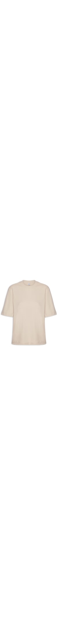 A blusa bege é confeccionada em tecido leve sem elasticidade. A peça solta ao corpo possui decote arredondado e mangas curtas.