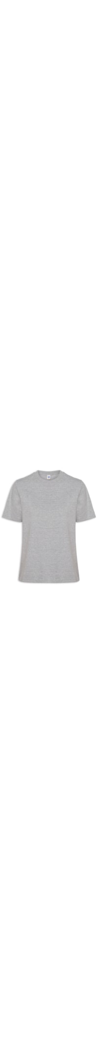 A blusa cinza é confeccionada em malha com média elasticidade. A peça solta ao corpo possui decote redondo com acabamento canelado e mangas curtas.