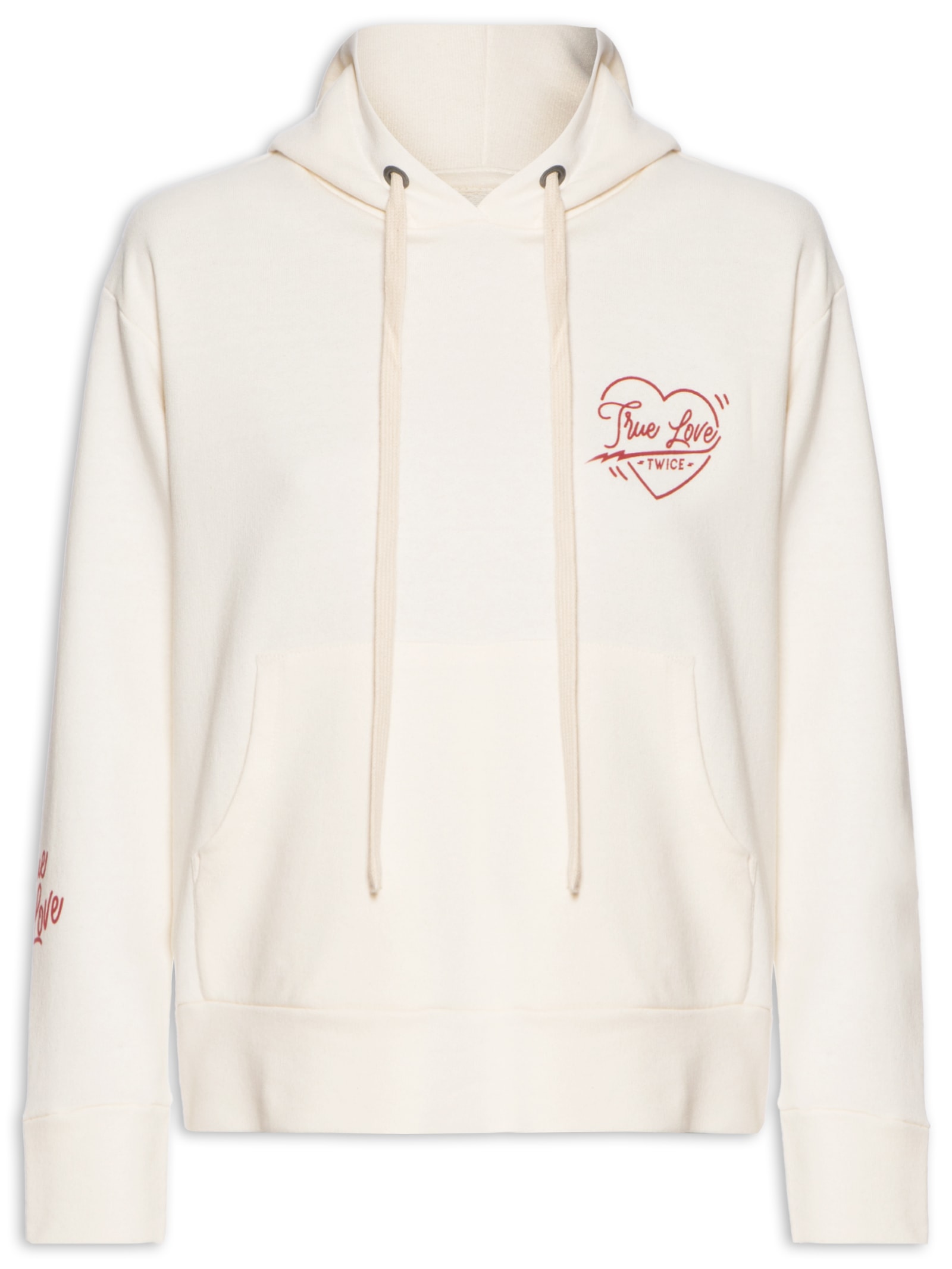 A blusa branca é confeccionada em moletom sem elasticidade. A peça solta ao corpo possui capuz com cordão embutido para ajuste, ombros estendidos, mangas longas com ajuste nos punhos com bordado figurativo de coração na cor vermelha, bolsos frontais de modelo canguru, bordado figurativo e de escrita aplicados na parte frontal e posterior na cor vermelha e tag da marca metalizada aplicada no decote posterior.