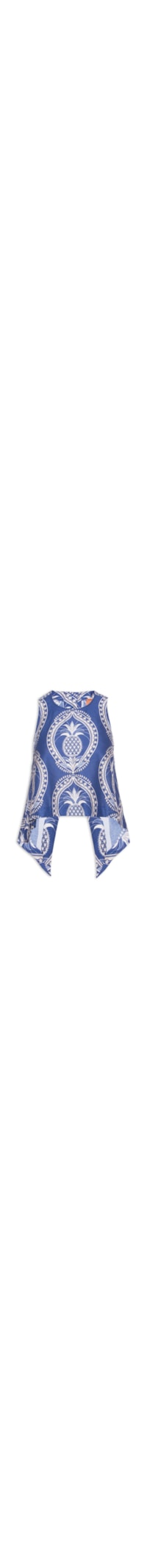 A regata azul é confeccionada em tecido leve sem elasticidade. A peça solta ao corpo possui decote trapézio, alças médias, cavas estendidas, mix de estampas em cor contrastante, decote posterior vazado e fechamento por botões.