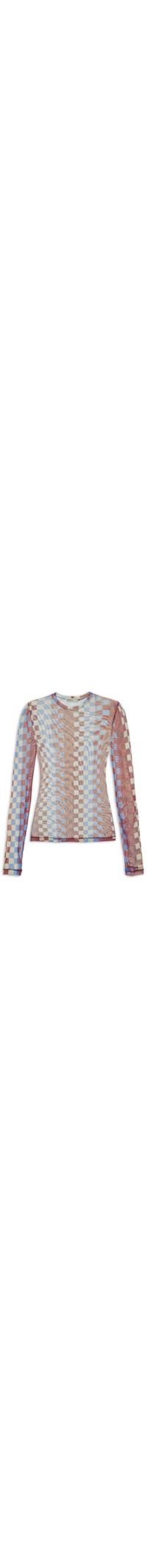 A blusa marrom é confeccionada em tule com alta elasticidade. A peça solta ao corpo possui decote redondo, mangas longas, padronagem listrada em cores contrastantes e transparência.