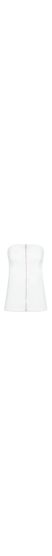 A blusa branca é confeccionada em malha canelada de média elasticidade. A peça justa ao corpo, de modelo tomara que caia, possui decote reto com elástico embutido, recortes frontais, tag metálica da marca aplicada na parte posterior do decote, sem bojo, forro no busto e fechamento frontal por zíper metálico.