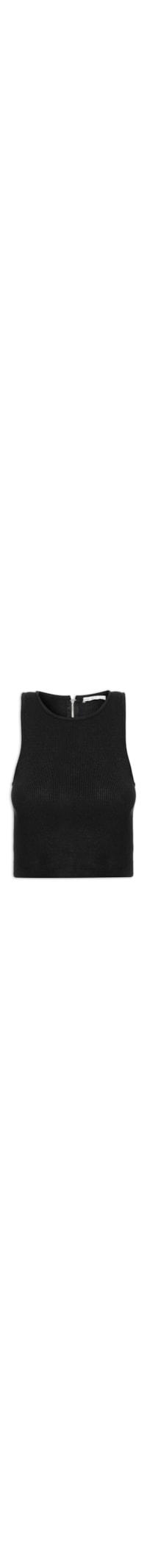 A blusa preta é confeccionada em tricot com superfície canelada e alta elasticidade. A peça justa ao corpo possui decote redondo, cavas estendidas, comprimento cropped* e fechamento posterior em zíper.