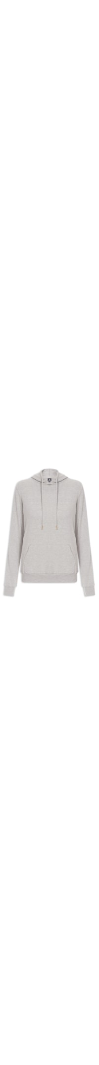 O blusão cinza é confeciconado em moletom. A peça possui capuz com cordão aplicado para ajustes, mangas longas, bolso frontal modelo canguru, caimento reto e acabamento pespontado.