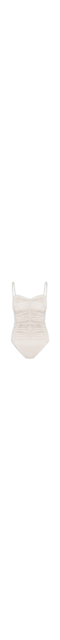 O body off white é confeccionado em malha com alta elasticidade. A peça justa ao corpo possui decote V, alças finas com regulagem, recorte frontal, franzidos nas partes laterais e no recorte frontal, drapeado posterior e frontal, sem bojo e fechamento inferior por botões de pressão.