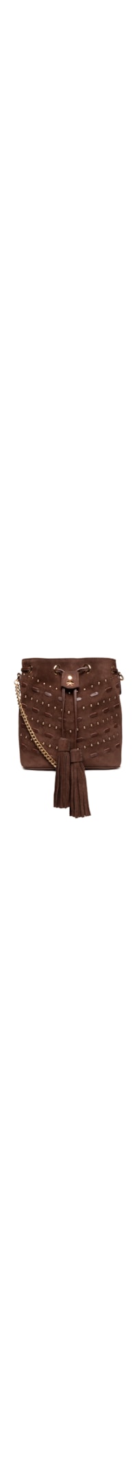 A bolsa marrom é produzida em camurça. A peça possui tamanho pequeno, formato retangular, alça fixa em corrente metalizada, compartimento interno com forro, recortes com tiras finas embutidas na parte frontal, aplicação de esferas e aviamentos metalizadas na parte frontal, tiras finas com detalhe em tássel embutidas na parte superior e fechamento superior por puxador regulável.