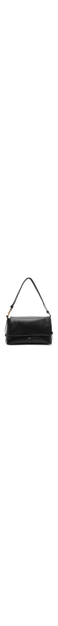 A bolsa preta é produzida em couro. A peça possui formato retangular, compartimento interno amplo, alça fixa em cordão com detalhe de nó e aplicação de aviamento metalizado em formato orgânico, nome da marca timbrado na parte frontal e aba sobreposta a parte frontal com fechamento por botão magnético.