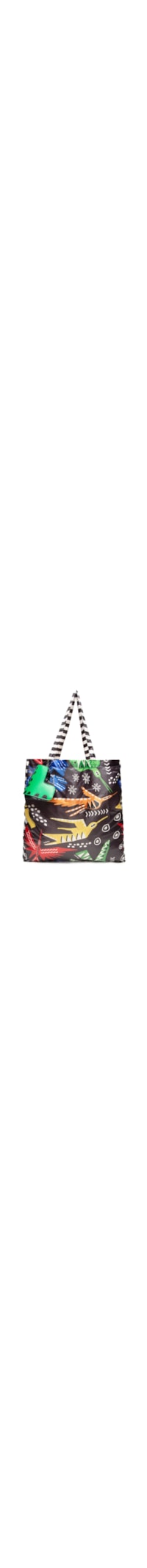 A bolsa preta é produzida em nylon. A peça possui tamanho grande, compartimento interno amplo, alças fixas, mix de estampas em cores contrastantes e sem fechamento. Acompanha mini bolsa em formato figurativo de cacho de bananas, fechamento por zíper e removível por mosquetão metálico.