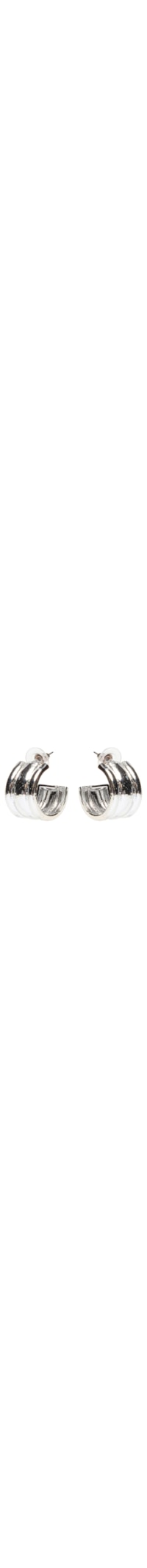O brinco prateado é produzido em metal. A peça de modelo argola possui tamanho pequeno, espessura grossa, recortes em baixo-relevo e fechamento posterior por tarraxa.