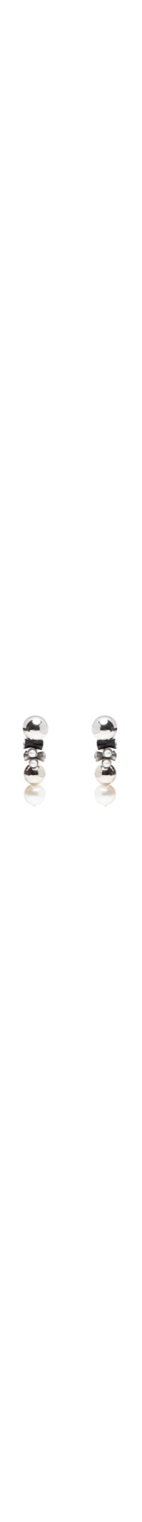 O brinco prata é produzido em metal. A peça possui tamanho grande, comprimento alongado, esferas metálicas, ponteira em pedra perolada com aplicação de strass na parte inferior, aplicação de formato orgânico com pedra perolada e strass, acabamento polido e fechamento posterior por tarraxa.
