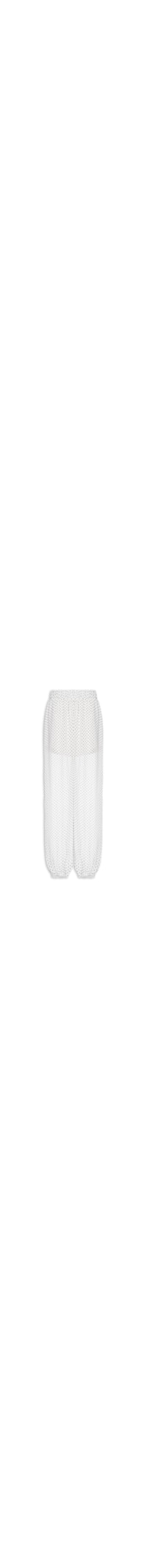 A calça off white é confeccionada em tecido leve sem elasticidade. A peça solta ao corpo de modelo jogger* possui cintura alta, cós com elástico embutido, padronagem de poá em cor contrastante, elástico embutido na barra, meio forro, transparência e comprimento cropped**.
