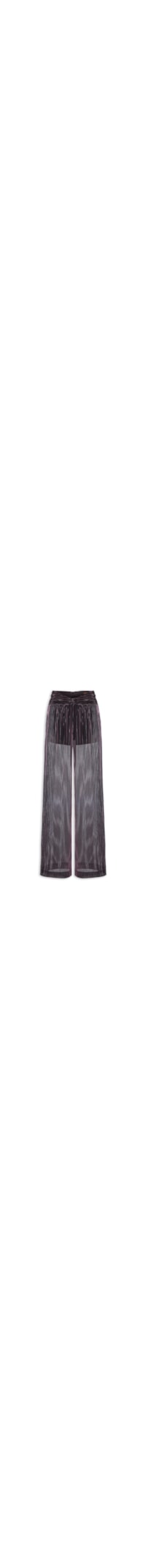 A calça preta é confeccionada em malha com média elasticidade. A peça solta ao corpo possui cintura alta, cós amplo com recorte posterior e detalhe de torção na parte frontal, meio forro, transparência, padronagem listrada nas cores prata e vinho com efeito degradê, comprimento longo e fechamento posterior por zíper invisível.
