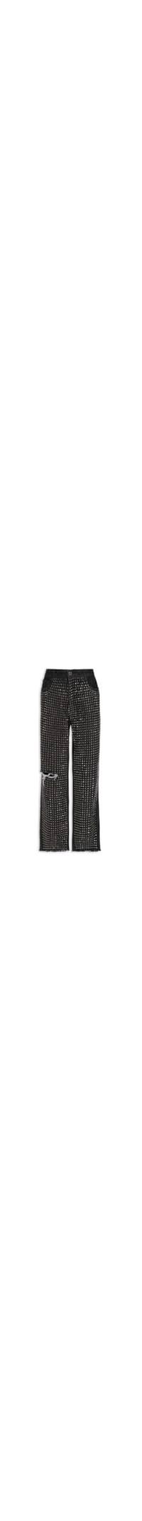 A calça preta é confeccionada em sarja. A peça possui cintura alta, cós com passantes aplicados e tag da marca na parte posterior, five pockets* com rebites metalizados e detalhe de puídos nos bolsos posteriores, superfície frontal com hotflix e detalhe destroyed**, barra com acabamento desfiado, comprimento cropped***, shape solto, caimento reto, acabamento pespontado e fechamento frontal por botão e zíper.