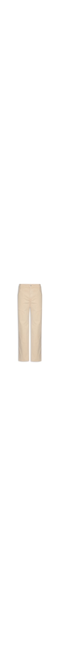 A calça bege é confeccionada em sarja com média elasticidade. A peça solta ao corpo possui cintura média, cós com passantes, recorte posterior, five pockets*, ilhós aplicado no bolso posterior com detalhe do nome da marca em baixo-relevo, comprimento longo e fechamento frontal por botão e zíper.