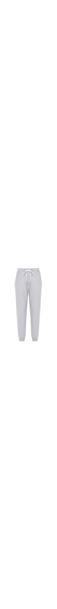 A calça cinza é confeccionada em moletom. A peça de cintura média, possui cós elástico com cordão embutido para ajuste, bolsos frontais modelo faca, bolsos posteriores, shape solto, caimento reto e acabamento canelado.