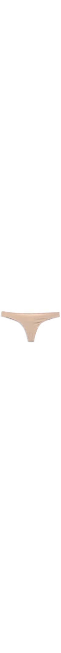 A calcinha bege é confeccionada em malha de poliamida. A peça de modelo fio dental possui laterais finas, forro em algodão, elástico aplicado com nome da marca em cor contrastante, tecido posterior duplo e acabamento pespontado.