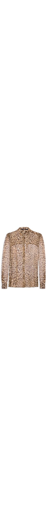 A camisa marrom é confeccionada em tecido leve sem elasticidade. A peça solta ao corpo possui colarinho clássico, mangas longas com abotoamento nos punhos, recorte posterior, fendas laterais, padronagem de animal print, barra mullet* e fechamento frontal por botões.