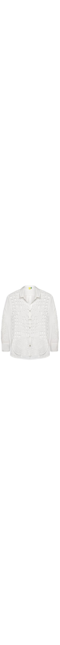 A camisa branca é confeccionada em tecido leve sem elasticidade. A peça solta ao corpo possui gola clássica, decote em V formado pelo fechamento frontal por botões, mangas longas com punhos simples, estrutura vazada com trabalho artesanal em padrão geométrico e floral, transparência distribuída ao longo do corpo, barra reta e acabamento delicado nas extremidades.