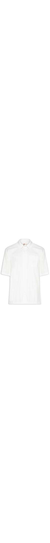 A camisa branca é confeccionada em tecido leve com baixa elasticidade. A peça solta ao corpo possui colarinho simples, mangas curtas, bolso frontal, recorte posterior, superfície canelada, logo frontal da marca bordado no bolso e também na parte posterior, barra reta e fechamento por botões frontais.