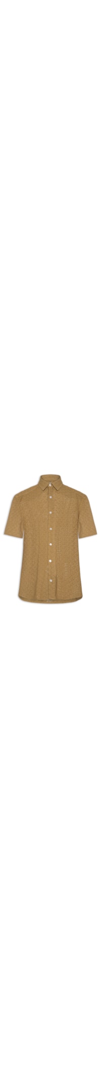 A camisa marrom é confeccionada em tecido laise sem elasticidade. A peça solta ao corpo possui colarinho clássico, mangas curtas, recorte posterior e abotoamento na parte frontal.