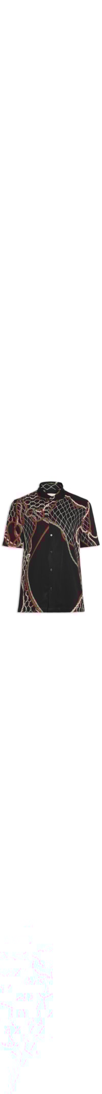 A camisa preta é confeccionada em tecido leve sem elasticidade. A peça solta ao corpo possui colarinho clássico, recorte na parte posterior, estampa figurativa de nós por toda a peça e fechamento por botões na parte frontal.