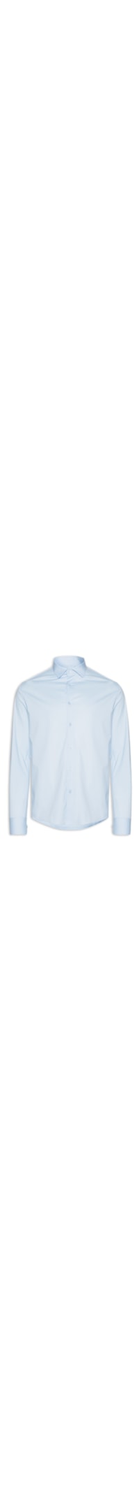 A camisa azul é confeccionada em tecido leve com baixa elasticidade. A peça solta ao corpo possui colarinho clássico, mangas longas com abotoamento nos punhos, recorte posterior, tag da marca aplicada na parte posterior, barra arredondada e logo da marca bordada na parte frontal.