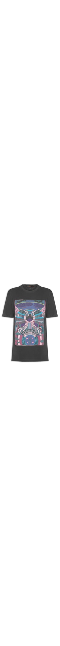 A camiseta preta é confeccionada em malha de algodão com baixa elasticidade. A peça solta ao corpo possui decote arredondado com acabamento canelado, mangas curtas e estampa figurativa em cores contrastantes.